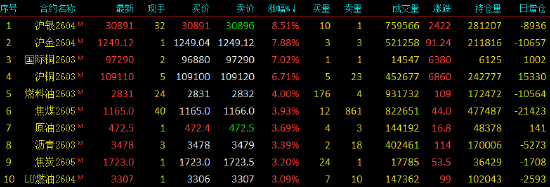 2026年1月29日,内盘期货多数收涨,沪银收涨逾8%,沪金涨近8%,国际铜涨7%,沪铜涨逾6%,燃油涨4%,焦煤、原油、沥青、焦炭、低硫燃油涨逾3%;多晶硅收跌逾4%,碳酸锂跌逾3%。