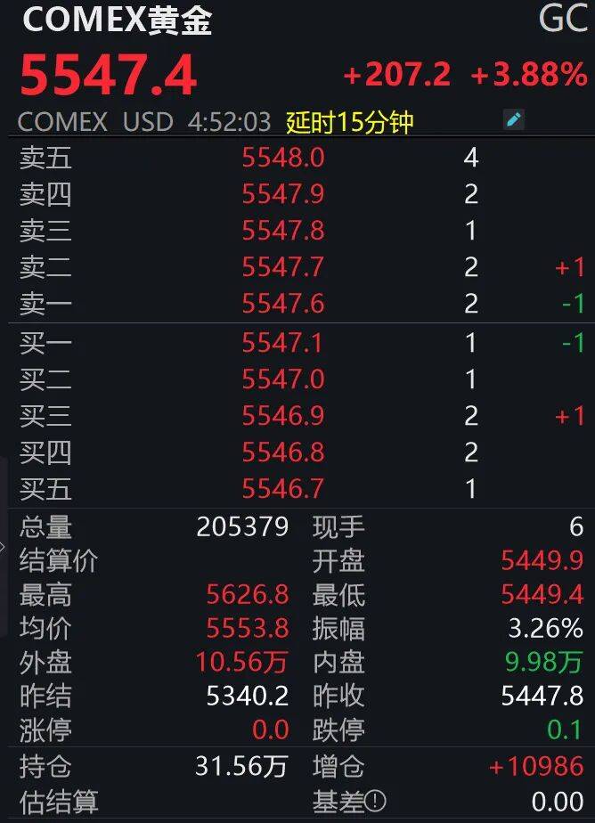 期货市场同步跟涨。COMEX黄金期货价格持续上探,盘中接连升破5500美元/盎司、5600美元/盎司两大关键点位。截至发稿,COMEX黄金期货日内上涨3.88%,报5547.4美元/盎司,盘中最高触及5626.8美元/盎司,再创历史新高。