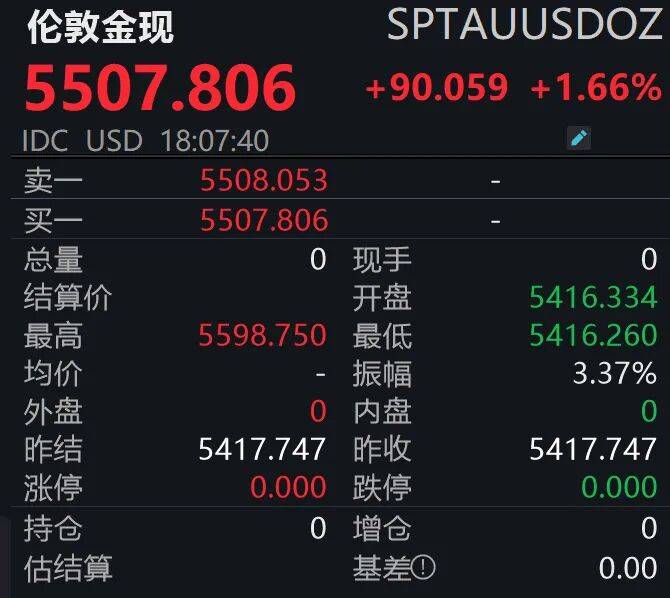 1月29日,国际金价持续攀升,伦敦金现突破5500美元/盎司整数关口。截至发稿,伦敦金现日内大涨1.66%,报5507.806美元/盎司,盘中最高触及5598.75美元/盎司,距5600美元/盎司大关仅一步之遥,连续刷新历史纪录。