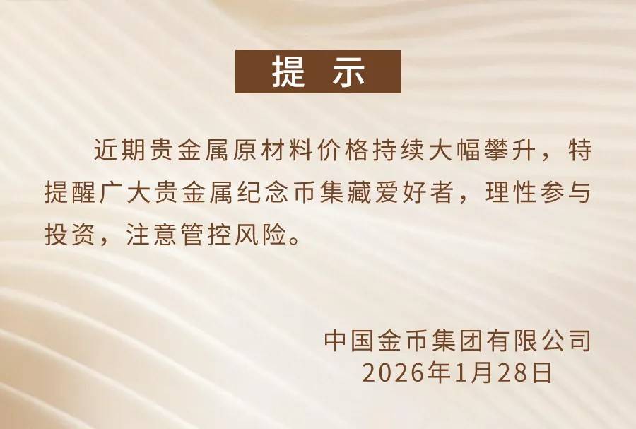 中新网1月29日电 据“中国金币”微信公众号消息,中国金币集团有限公司29日发布重要提示称,近期贵金属原材料价格持续大幅攀升,特提醒广大贵金属纪念币集藏爱好者,理性参与投资,注意管控风险。