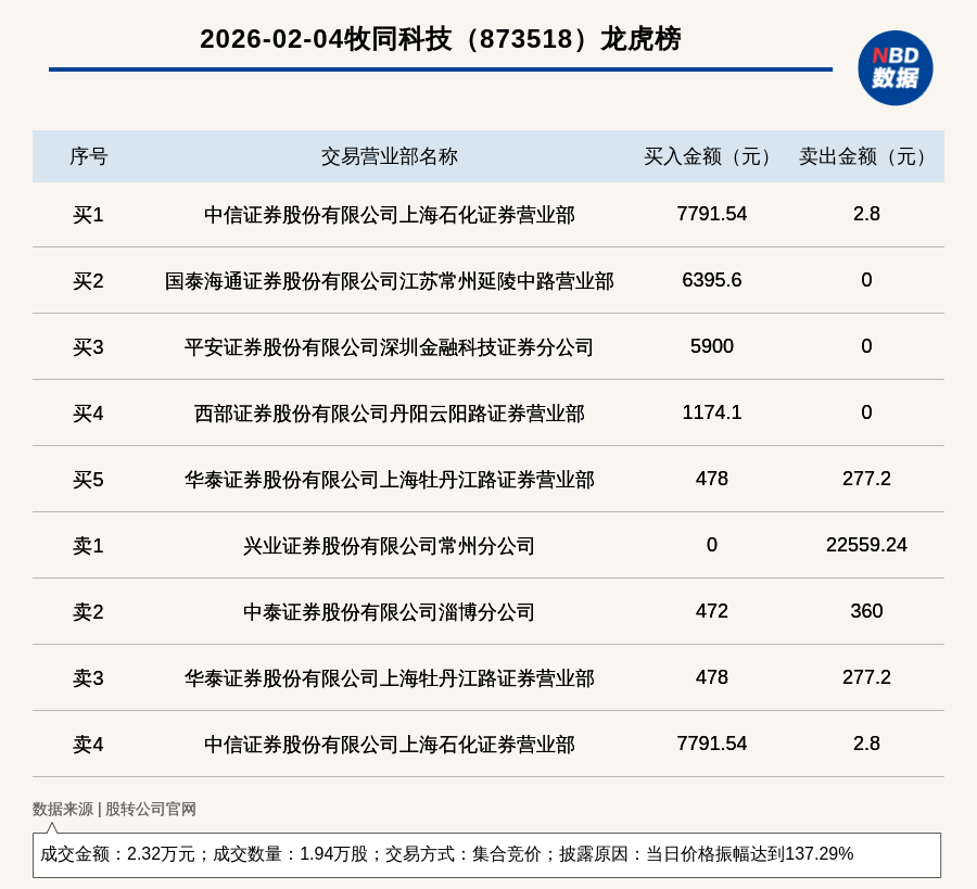 每经讯,2026年2月4日,新三板创新层公司牧同科技(873518,收盘价:1.18元)登上龙虎榜,交易方式是集合竞价,披露原因是当日价格振幅达到137.29%,成交数量1.94万股,成交金额2.32万元。买一席位为中信证券股份有限公司上海石化证券营业部,买入7791.54元;卖一席位为兴业证券股份有限公司常州分公司,卖出2.26万元。