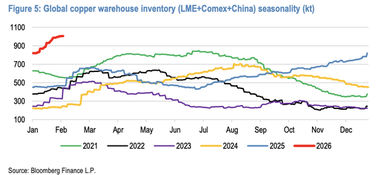 据追风交易台,摩根大通(J.P. Morgan)亚太股票研究团队于2026年2月3日发布《Copper Dashboard》(Lyndon Fagan等),指出全球可见铜库存在一年内增长超过一倍,从去年同期的约47万吨飙升至约100万吨,达到五年新高。尽管全球矿山出现供应中断,第四季度库存仍持续攀升,显示供需格局正在发生转变。