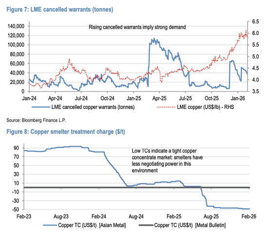 摩根大通监测的多项高频指标呈现出复杂局面。一方面,铜精矿加工费(TC/RC)持续为负值,表明原料端供应依然紧张,冶炼厂在采购环节议价能力较弱。
