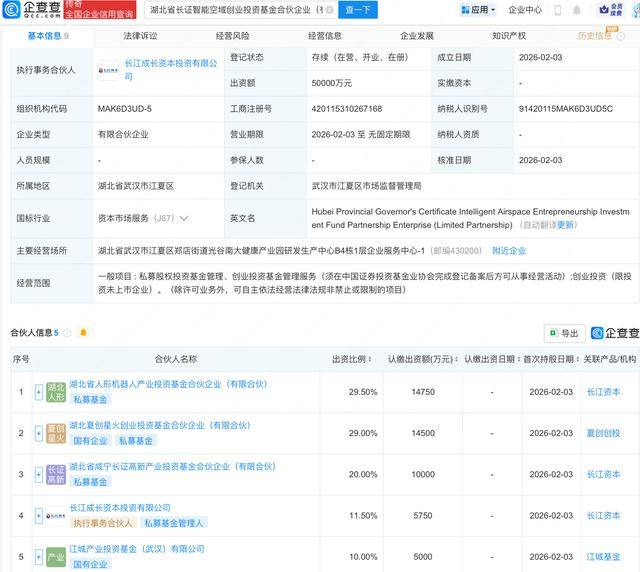 据企查查信息显示,日前,湖北省长证智能空域创业投资基金合伙企业(有限合伙)成立,出资额5亿人民币。合伙人信息显示,5位合伙人分别为湖北省人形机器人产业投资基金合伙企业(有限合伙)、湖北夏创星火创业投资基金合伙企业(有限合伙)、湖北省咸宁长证高新产业投资基金合伙企业(有限合伙)、长江成长资本投资有限公司以及江城产业投资基金(武汉)有限公司。