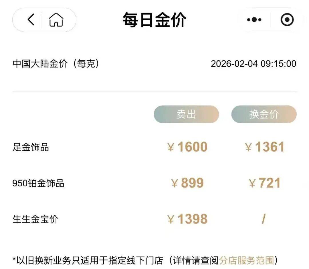 2月4日,现货黄金重新站上5000美元大关,一度涨超2%。国内金饰价格方面,周生生足金饰品报1600元/克,较前一日1498元/克涨102元。