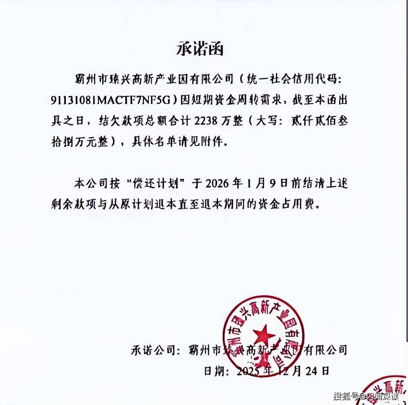 另据风口财经了解,霸州高新曾于2025年12月24日出具书面承诺函,称因短期资金周转需求,结欠款项合计2238万元,并承诺于2026年1月9日前全部结清。但截至该日期,上述款项仍未清偿。