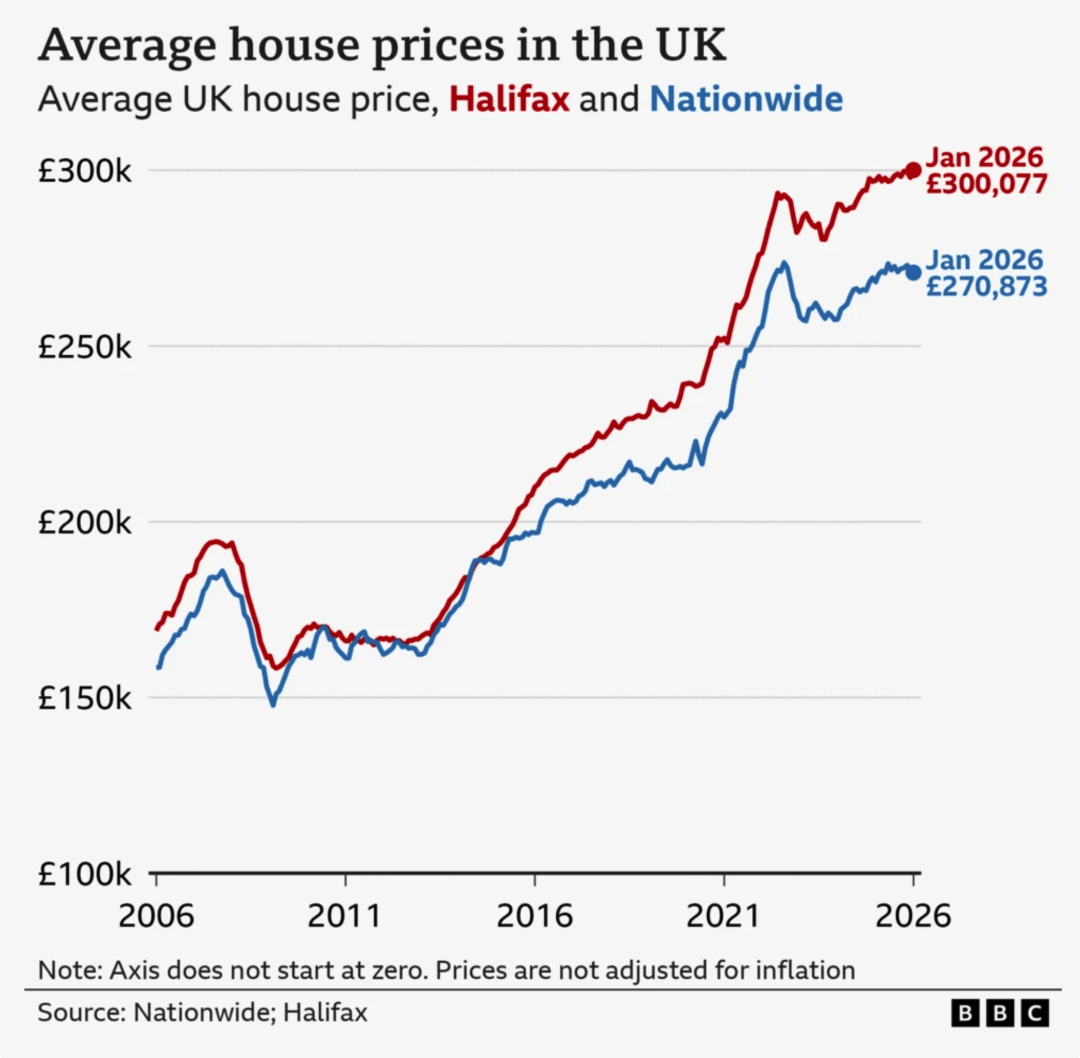 英国最大抵押贷款银行Halifax最新统计数据显示,2026年1月份英国房价上涨0.7%,同比上涨1%,使平均总房价首次超过了30万英镑(300,077英镑)。Halifax预测,今年房价可能会上涨1%-3%。