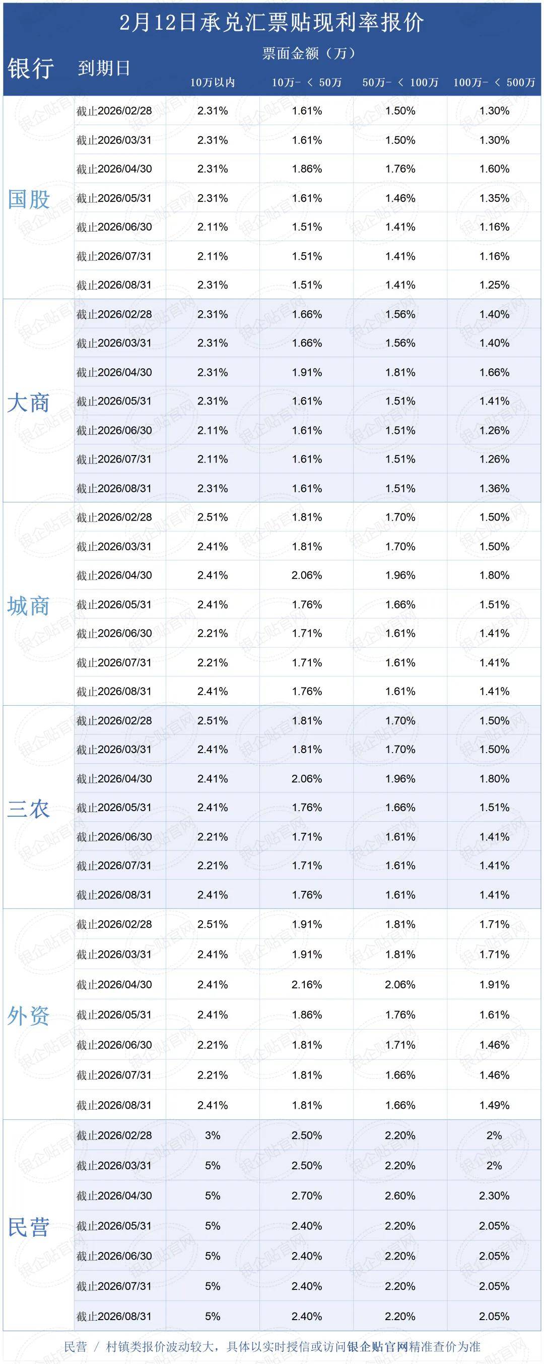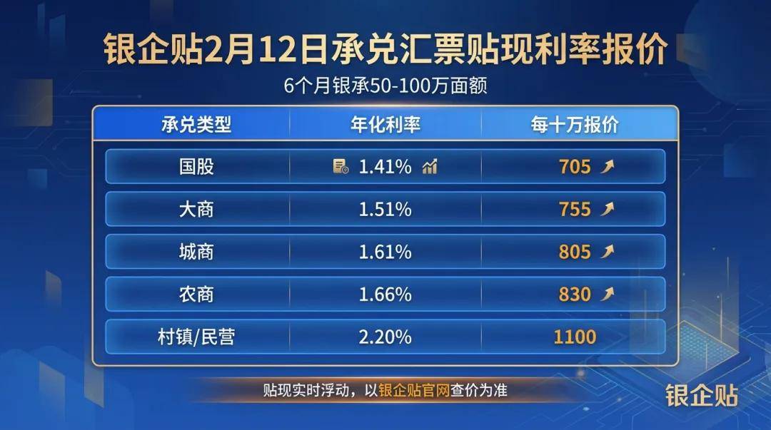 今天(2月12日)主流渠道银行报价出炉:银行承兑汇票贴现利率整体延续低位震荡,国股类短期票(半年期)10万以内年化2.31%,大额票(100万以上)更低至1.30%-1.35%,同张票差价近1个点!当前流动性宽松(DR007等短端资金价格回落),票据市场供给充裕,正是中小微锁定低成本融资的好时机。但民营/村镇票波动大,建议优先国股/大商背书。