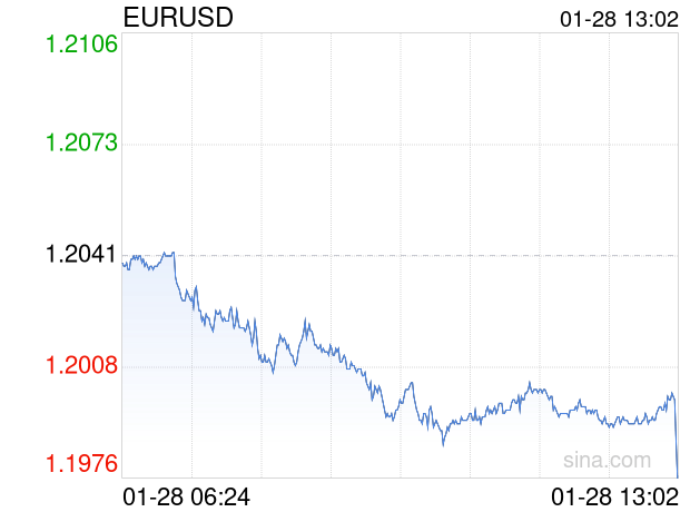 新浪外汇消息2026年01月28日,截至13时02分,外汇市场上欧元兑美元汇率跌破1欧元兑换1.1975美元。跌幅为-0.5481%