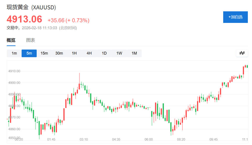 现货黄金周三低开后,较日低拉升超1%,重回4900美元上方。白银同样反弹上行,涨逾1%。
