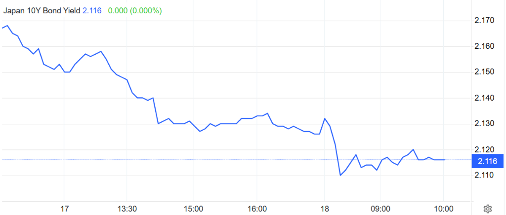 投资者对新内阁可能延续或加码经济刺激政策的预期,推动日本股债齐涨,日本各期限国债收益率全面下行,10年期国债收益率下行至2.116%附近。