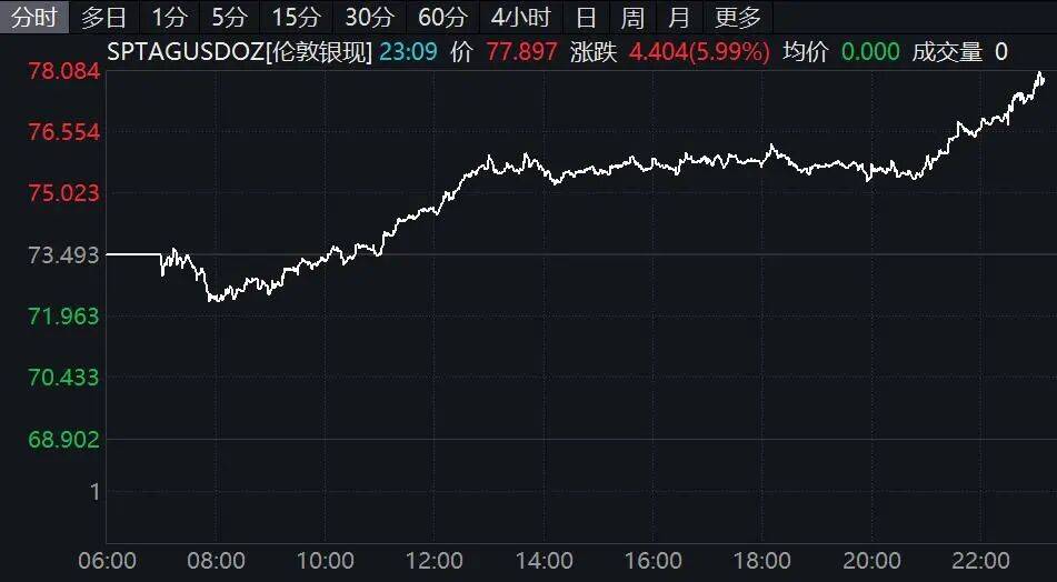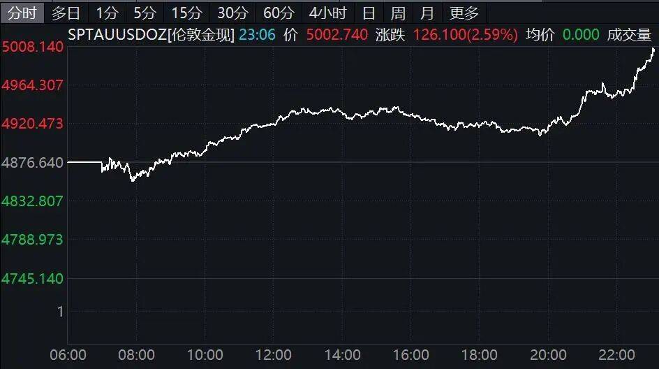 国际贵金属集体拉升,截至发稿,现货黄金再度站上5000美元/盎司,涨超2.5%,现货白银涨幅扩大至6%,现货铂金涨超3%,现货钯金涨5.5%。纽约期银涨超5%,期金涨超2%。