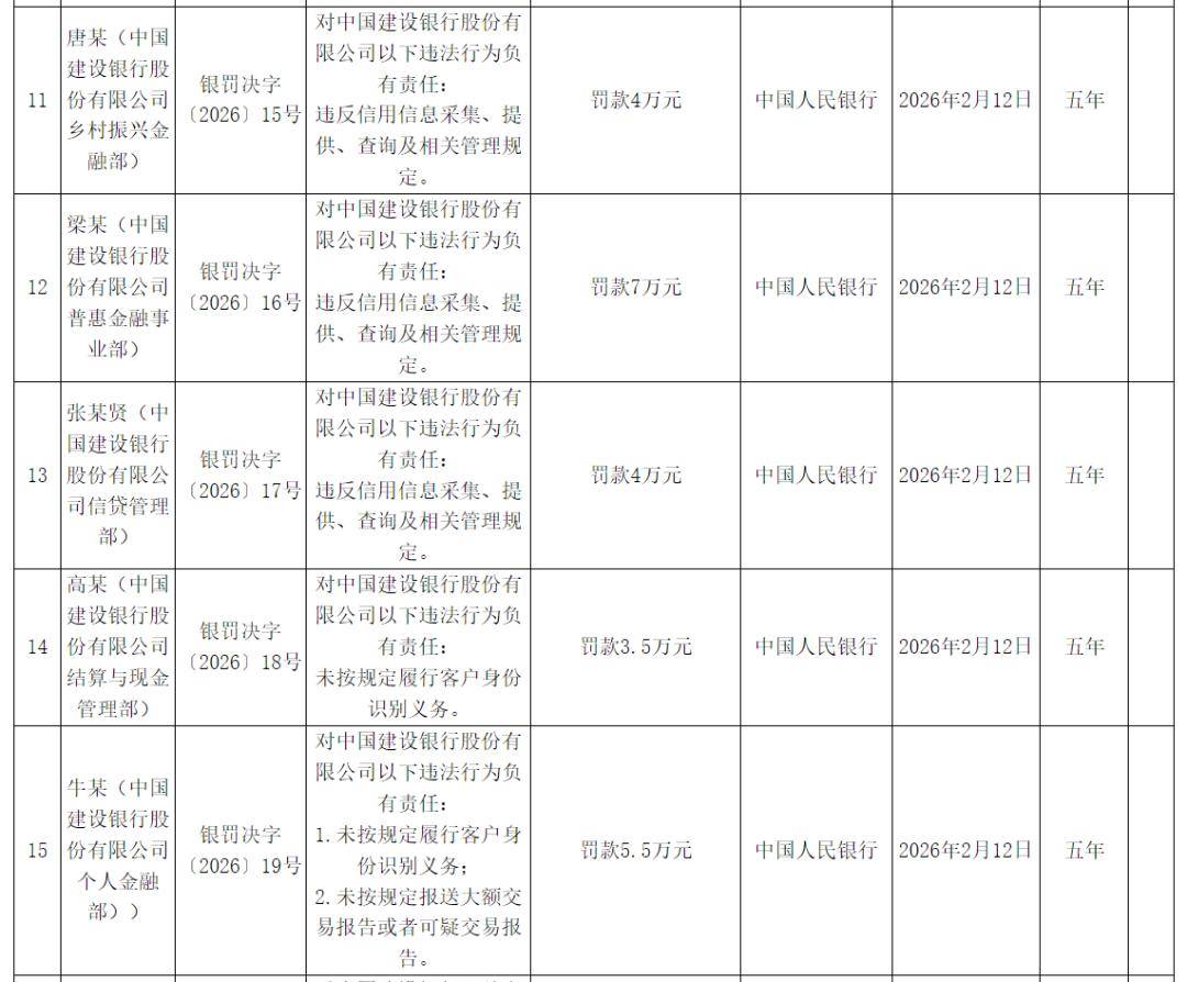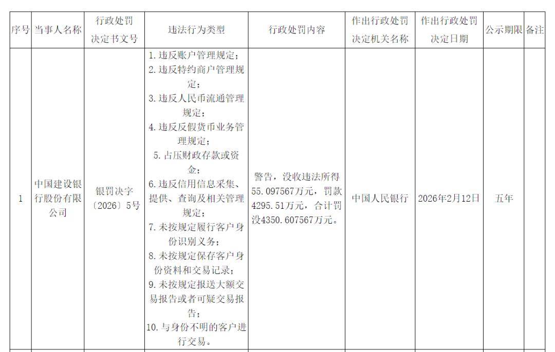 2026年2月12日,中国人民银行集中公布一批行政处罚决定,针对中国建设银行股份有限公司(以下简称“建设银行”)存在的多项违法违规行为,依法作出严厉处罚,同时对22名相关责任人同步追责,合计罚没金额高达4350.607567万元,彰显了监管部门强化金融合规监管、严打违法违规行为、防范金融风险的坚定决心。