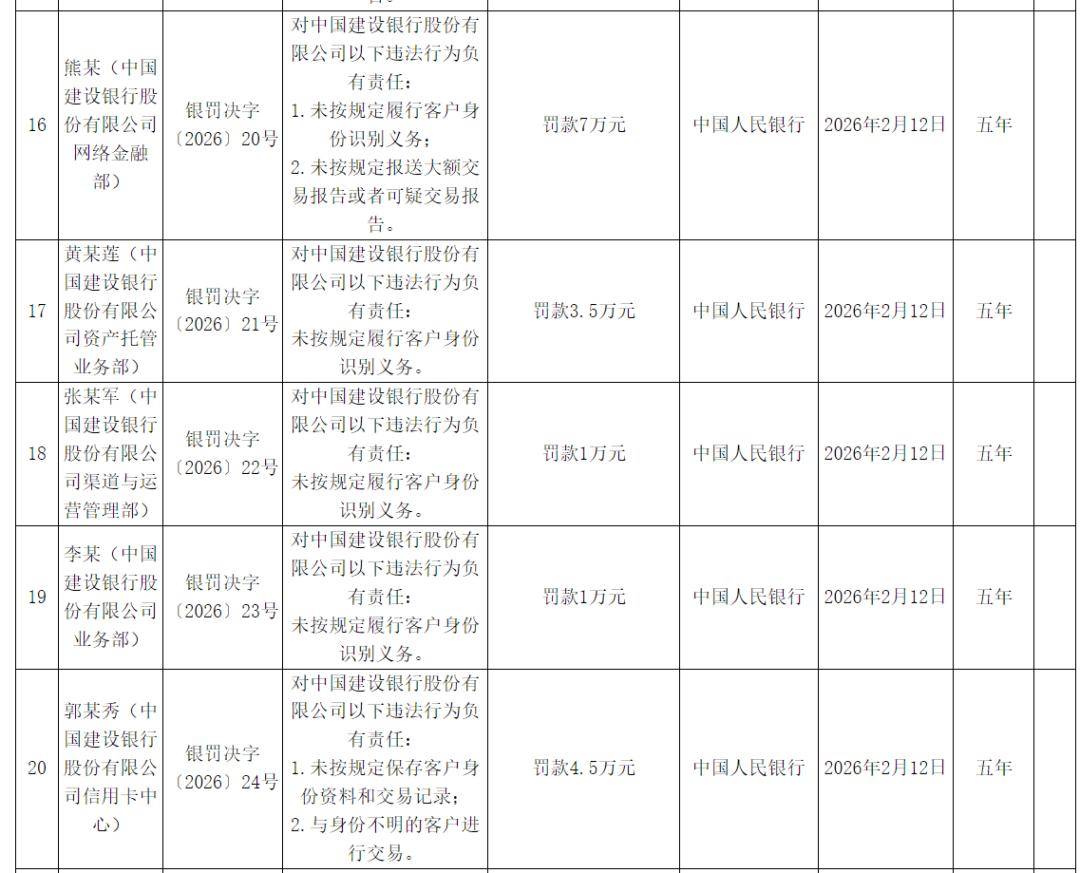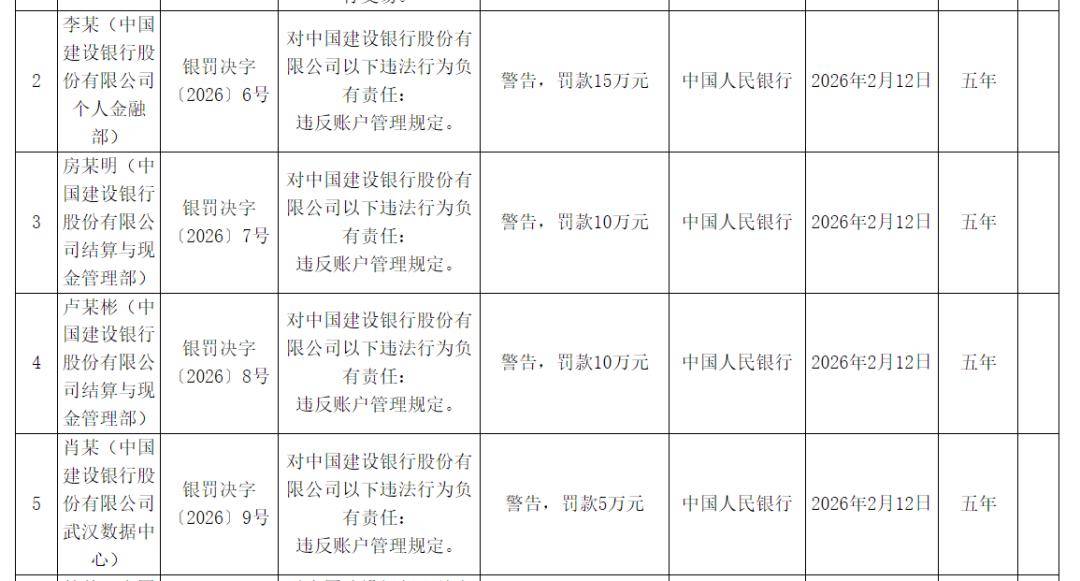 据悉,此次对建设银行的处罚决定书编号为银罚决字〔2026〕5号,