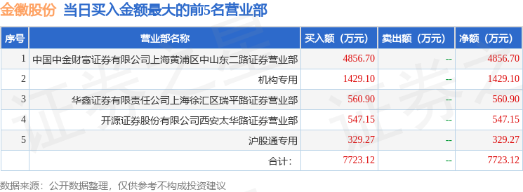 证券之星消息,沪深交易所2026年1月26日公布的交易公开信息显示,金徽股份(603132)因有价格涨跌幅限制的日收盘价格涨幅偏离值达到7%的前五只证券登上龙虎榜。此次是近5个交易日内第1次上榜。