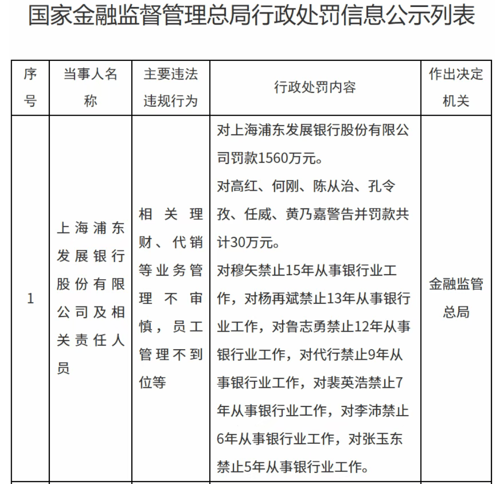 2025年12月19日,浦发银行因相关理财、代销等业务管理不审慎,员工管理不到位等,再次被金融监管总局罚款1560万元。