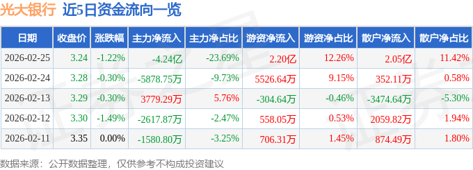证券之星消息,截至2026年2月25日收盘,光大银行(601818)报收于3.24元,下跌1.22%,换手率1.18%,成交量549.01万手,成交额17.91亿元。