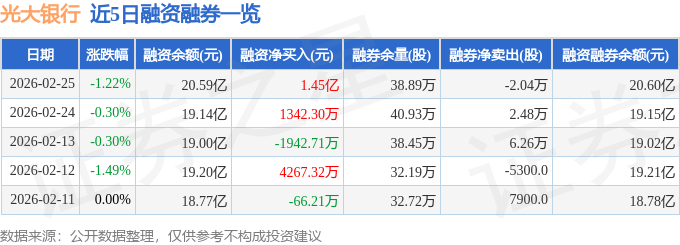 光大银行融资融券信息显示,融资方面,当日融资买入3.07亿元,融资偿还1.63亿元,融资净买入1.45亿元。融券方面,融券卖出14.19万股,融券偿还16.23万股,融券余量38.89万股,融券余额126.0万元。融资融券余额20.6亿元。