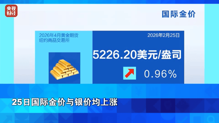美国白宫酝酿出台15%的全球关税税率,引发投资者避险情绪升温,加之美元指数下跌, 国际金价周三上涨,重回每盎司5200美元关口上方。截至收盘,纽约商品交易所4月交割的黄金期价收于每盎司5226.20美元,涨幅为0.96%。