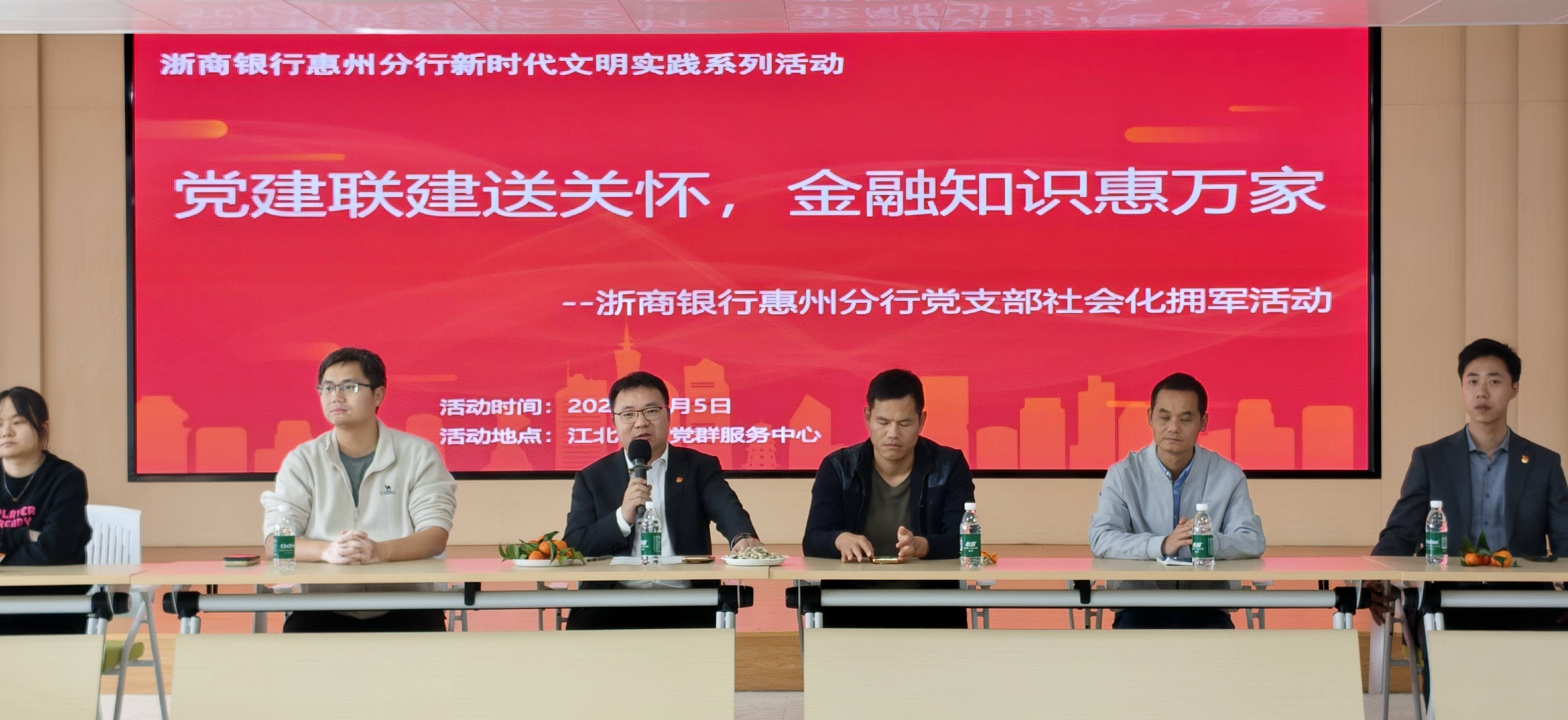 近日,浙商银行惠州分行党支部以党建联建为纽带,紧扣金融惠民、社会化拥军要求,携手惠城区江北街道期湖塘社区党委,开展“党建联建送关怀 金融知识惠万家”春节慰问座谈会暨双拥志愿服务活动,将新春暖意送到群众身边,实现同学共建、落地服务举措,让党建引领金融服务扎根基层。