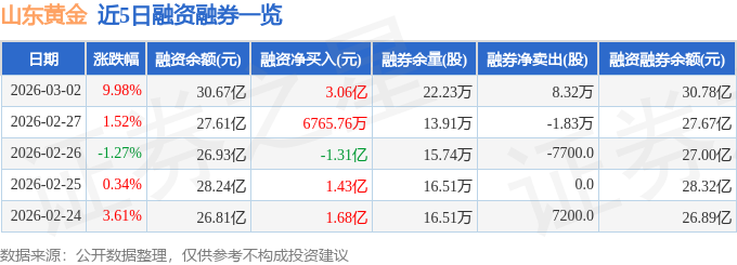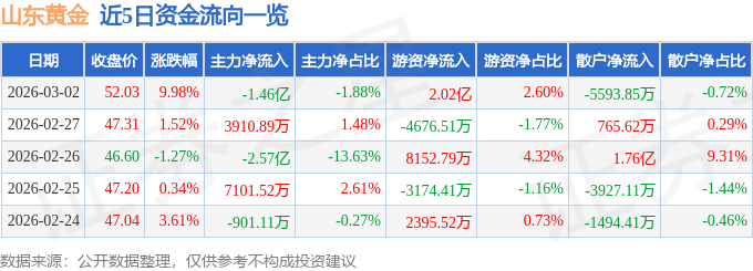 证券之星消息,截至2026年3月2日收盘,山东黄金(600547)报收于52.03元,上涨9.98%,换手率4.34%,成交量156.81万手,成交额77.51亿元。