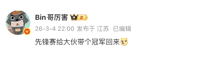 有意思的是,在赛后BIN也是立刻发了个动态,表示先锋赛给大伙带个冠军回来