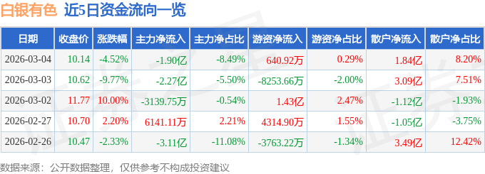 证券之星消息,截至2026年3月4日收盘,白银有色(601212)报收于10.14元,下跌4.52%,换手率2.98%,成交量220.42万手,成交额22.43亿元。