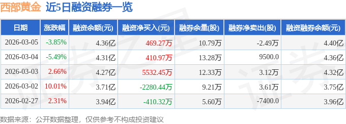 证券之星消息,截至2026年3月5日收盘,西部黄金(601069)报收于37.21元,下跌3.85%,换手率3.47%,成交量30.82万手,成交额11.53亿元。