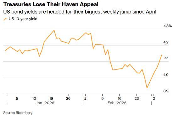 10年期美债收益率本周已飙升20个基点,料创下去年4月关税风波以来最大涨幅。这与上月创下一年来最大跌幅形成戏剧性反转。
