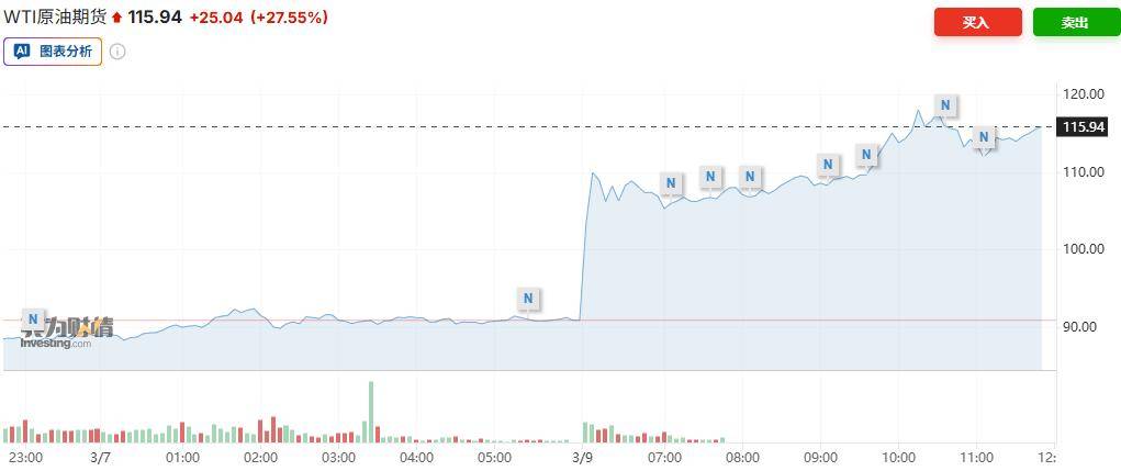 智通财经获悉,由于更多中东主要产油国削减产量,霍尔木兹海峡几乎完全关闭,而美国威胁要加深这场扰乱能源市场的冲突,油价飙升至每桶 120 美元附近。周一,布伦特原油价格一度飙升29%,至每桶119.50美元,创下2020年4月以来的最大单日涨幅;WTI原油价格也上涨了31%。由于霍尔木兹港关闭,科威特和阿联酋的原油库存迅速饱和,两国已开始减产。伊拉克上周也开始逐步关闭原油生产。受美元走强和通胀担忧的影响,金价一度下跌3%至每盎司5015美元,随后跌幅有所收窄。与此同时,美元兑所有主要货币走强,美元指数一度上涨0.7%。