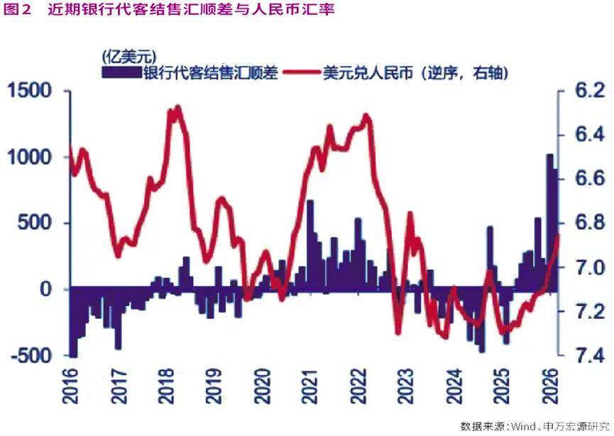不过,今年以来人民币升值的幅度要大于美元指数贬值的幅度,说明还有其他的因素在推动,机构认为结汇规模就是另一个重要原因。根据申万宏源证券的报告,2025年12月、2026年1月的结汇率分别提升至61%、59%,银行代客结售汇顺差也分别达到999亿美元、888亿美元。
