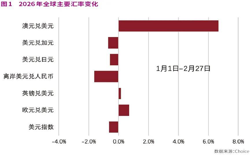 2026年以来,在美元指数小幅贬值的背景下,人民币汇率出现升值。截至2月底,年内美元指数贬值0.6%,离岸人民币汇率升至6.86附近,年内升值幅度约为1.6%。