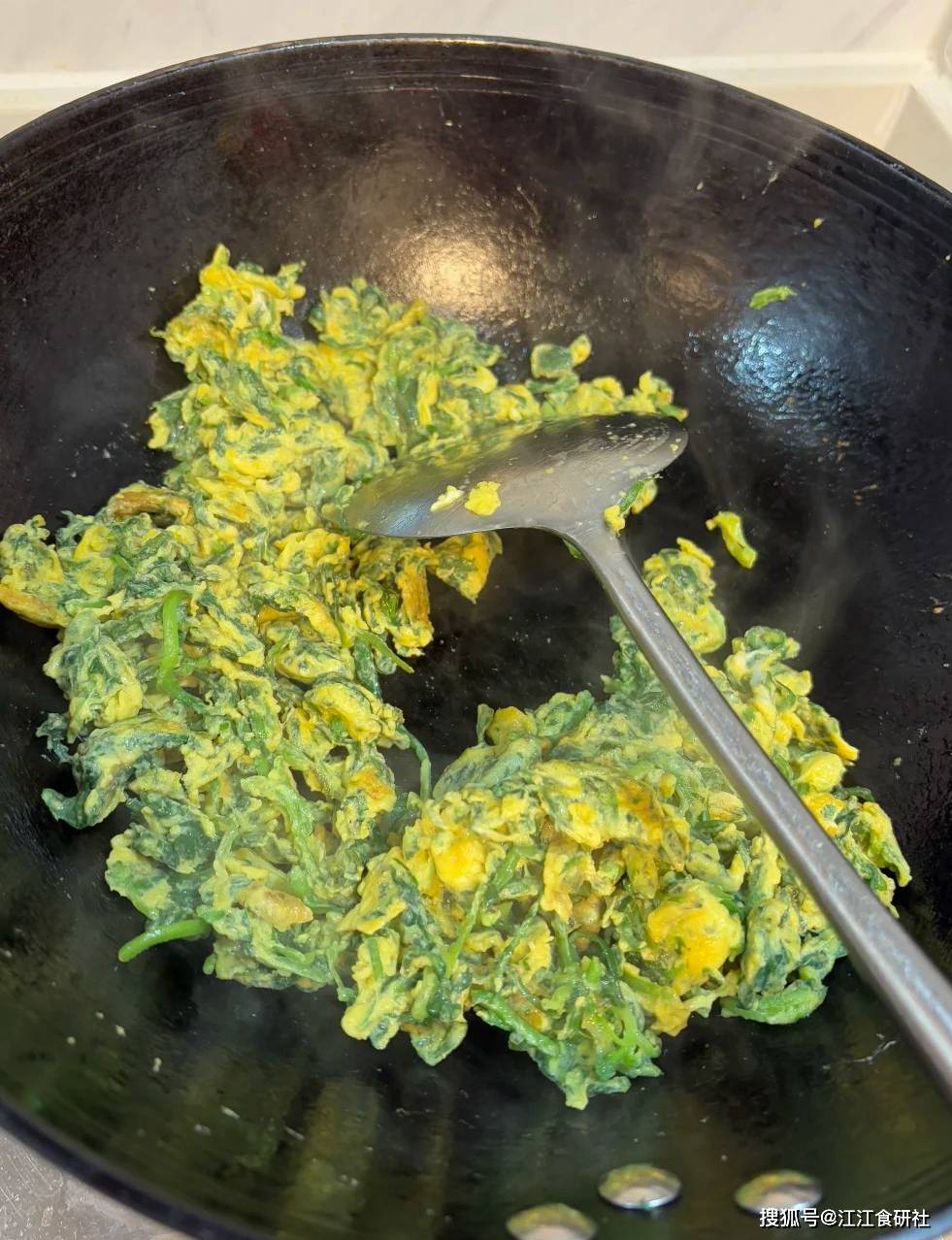 7、待鸡蛋全部凝固,呈现出金黄的色泽,与荠菜的翠绿相映时,就可以盛盘了。