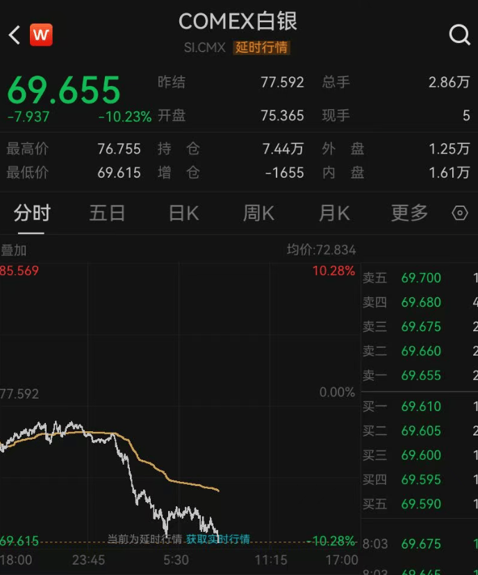 白银期货“崩盘”,COMEX白银期货跌超10%,现报69.65美元/盎司。