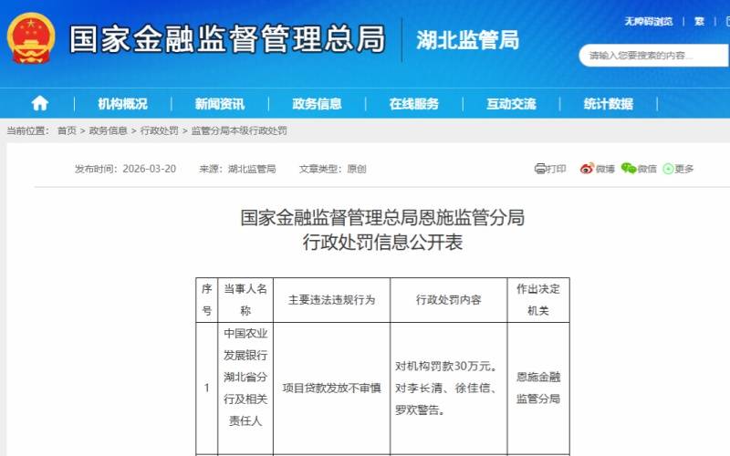 日前,国家金融监督管理总局恩施监管分局行政处罚信息公开表显示,中国农业发展银行湖北省分行及相关责任人,存在对项目贷款发放不审慎