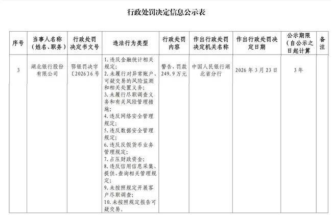 据行政处罚决定信息公示表,湖北银行存在以下违法行为:未履行对异常账户、可疑交易的风险监测和相关处置义务;未履行尽职调查义务和有关风险管理措施;违反网络安全管理规定;违反数据安全管理规定;违反反假货币业务管理规定;占压财政资金;违反信用信息采集、提供、查询相关管理规定;未按照规定开展客户尽职调查;未按照规定报告可疑交易等10项违法行为,被处以警告,并罚款249.9万元。