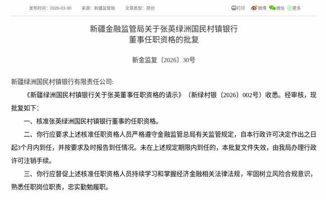 2026年3月30日,根据国家金融监督管理总局消息,《新疆绿洲国民村镇银行关于张英董事任职资格的请示》获得通过,批复张英新疆绿洲国民村镇银行有限责任公司董事的任职资格。