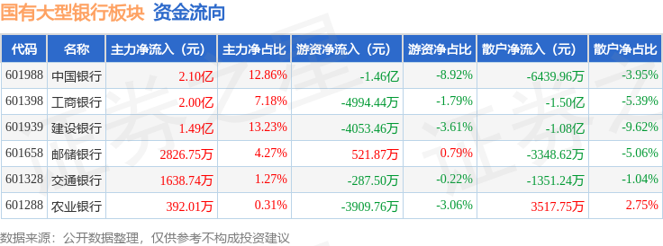 从资金流向上来看,当日国有大型银行板块主力资金净流入6.07亿元,游资资金净流出2.73亿元,散户资金净流出3.35亿元。国有大型银行板块个股资金流向见下表: