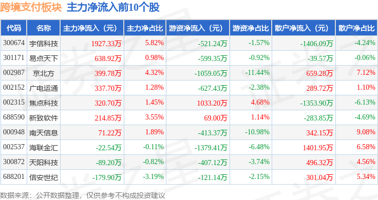 从资金流向上来看,当日跨境支付板块主力资金净流出10.4亿元,游资资金净流出2750.4万元,散户资金净流入10.68亿元。跨境支付板块个股资金流向见下表: