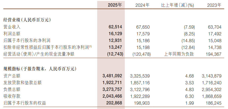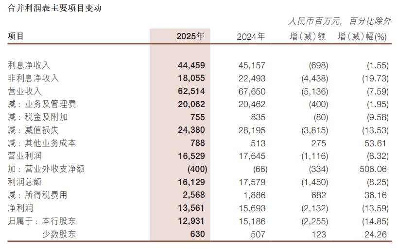 近日,该行披露了2025年度报告,营收利润双双下滑。其中营收同比下滑7.6%为625.1亿元;净利润同比下滑14.85%为129.3亿元。