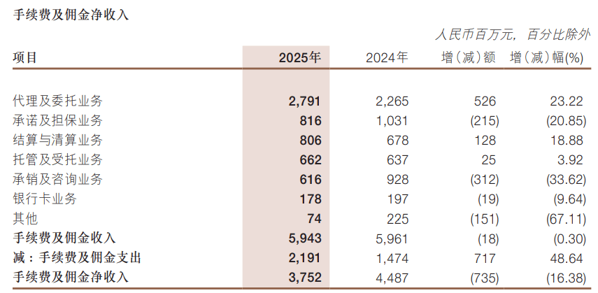 续费及佣金净收入浙商银行2025年为37.52亿元,同比下降、16.38%。其中承销及咨询业务收入下降 33.62%、承诺担保业务下降 20.85%。降幅也不小。
