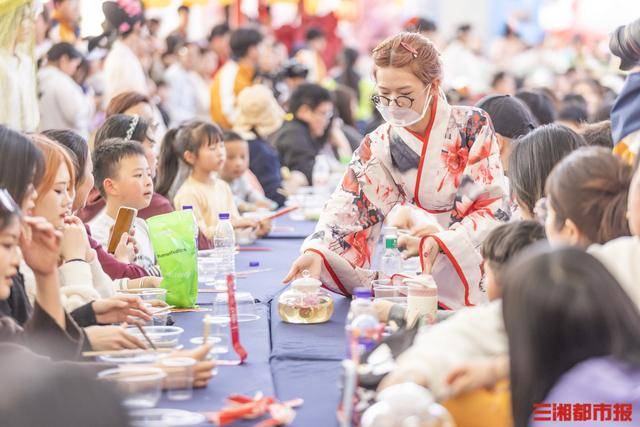 清明假期,景区打造长沙首个超大规模“吃+演+互动”一体化春日餐秀。百米花街落英缤纷,二十四花神穿梭其间,游客围坐长桌,免费品尝青团春卷鲜花饼、樱花糕等时令寒食,更有直径一米的巨型花花春饼惊艳亮相,百人分食春饼、共跳非遗摆手舞,沉浸式解锁古人花间雅集的浪漫。