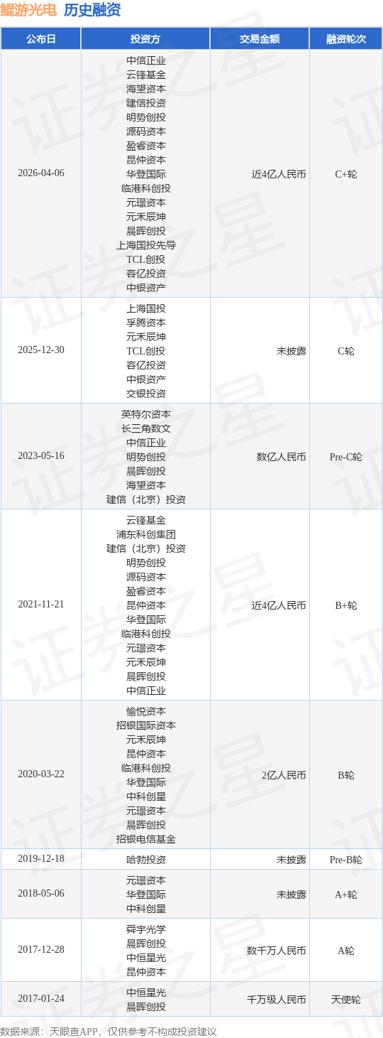 证券之星消息,根据天眼查APP于4月6日公布的信息整理,上海鲲游光电科技有限公司C+轮融资,融资额近4亿人民币,参与投资的机构包括中信正业,云锋基金,海望资本,建信投资,明势创投,源码资本,盈睿资本,昆仲资本,华登国际,临港科创投,元璟资本,元禾辰坤,晨晖创投,上海国投先导,TCL创投,容亿投资,中银资产。