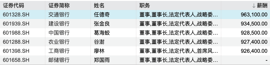 Wind已有数据显示,薪酬达到200万元以上的董事多数集中在平安银行、民生银行、招商银行以及中信银行。国有银行的董事、董事长级别高管,薪酬多在90万元水平。