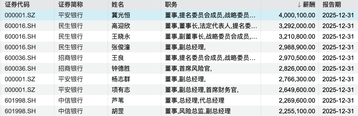 “百万薪酬”队伍中,还有民生银行董事长高迎欣,薪酬为329.2万元;民生银行副董事长、行长王晓永,薪酬为321.08万元;民生银行副行长张俊潼,薪酬为298.89万元;招商银行行长王良,薪酬为297.05万元;自2026年2月13日起上任邮储银行行长及执行董事的芦苇,2025年在中信银行获得的薪酬为226.96万元。