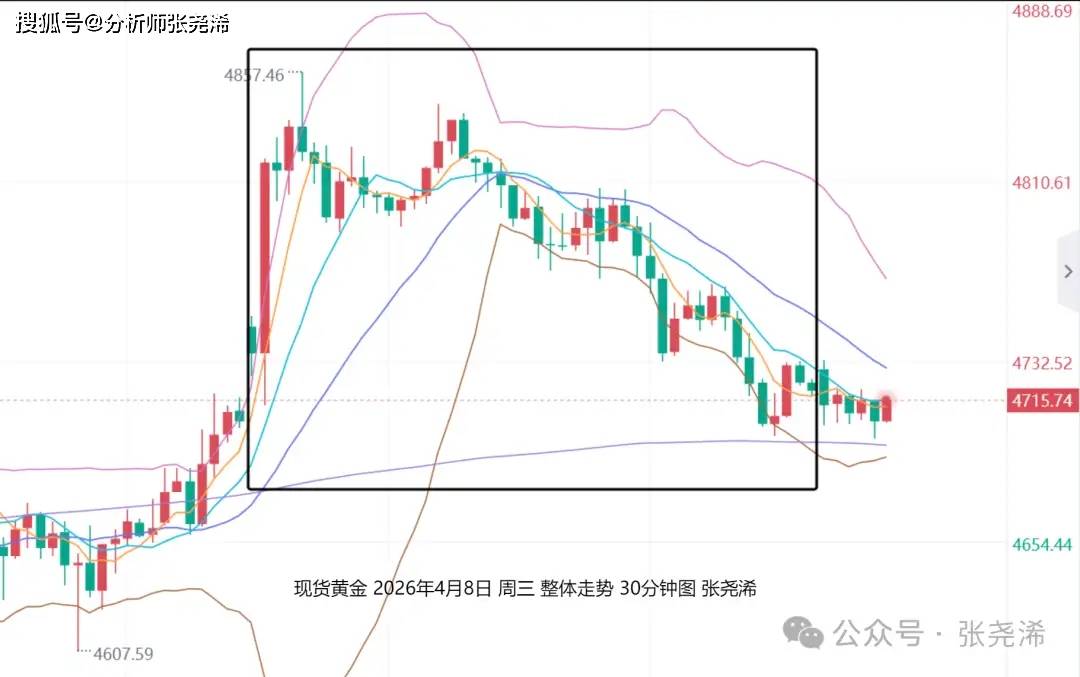 上交易日周三(4月8日):国际黄金冲高回落收取长上影线倒垂看空形态,虽然早盘因美伊同意停火2周,打压油价及美元大幅走低,推动金价拉升走强,但停火局面脆弱,伊朗和以色列恢复敌对行动,伊媒也表示霍尔木兹海峡已全面关闭,若以对黎袭击不停,伊朗将退出停火。美联储会议纪要也表示更多官员提及加息可能性,美伊局势再生变数,利率预期也有所转向,这打压金价回吐日内涨幅,并收线。