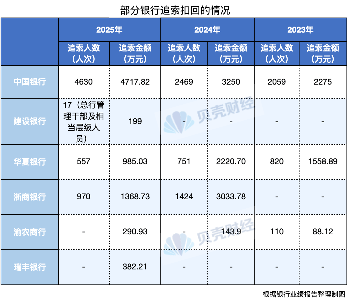 中国银行被追索的人数及金额最多。根据中国银行年报,2025年该行共计对4630人次执行追索扣回,金额合计4717.82万元。该行近年来追索扣回的力度持续增加,2024年该行共计对2469人次执行追索扣回,金额合计3250万元;而2023年则对2059人次追索扣回,金额合计2275万元。按此计算,三年间该行共对9158人次追索扣回,总金额超过亿元。