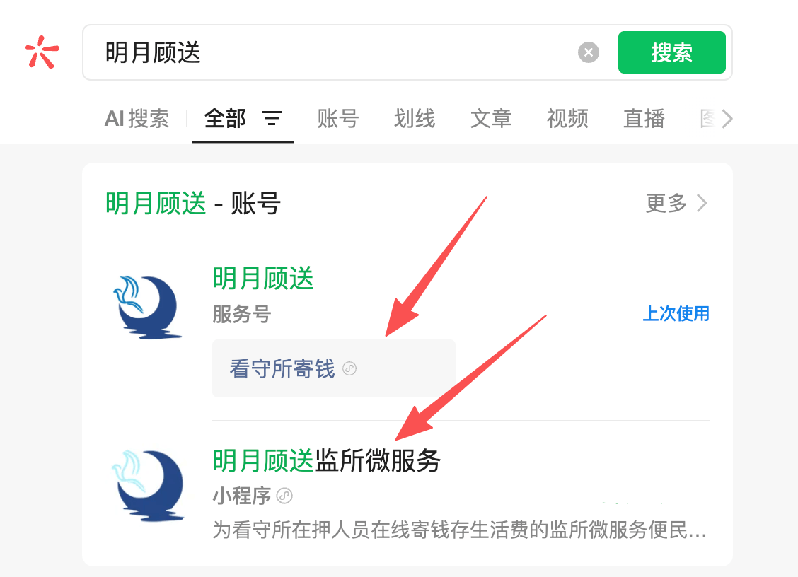 【小程序操作说明】搜索微信「明月顾送」,找到「明月顾送监所微服务」小程序。首次使用:选择要寄钱的看守所,填写在押人员身份信息完成绑定。后续寄钱:直接在「亲属寄钱」中选择已绑定的收款人,填写金额并支付即可,无需每次重复填写信息,绑定的信息长期有效。