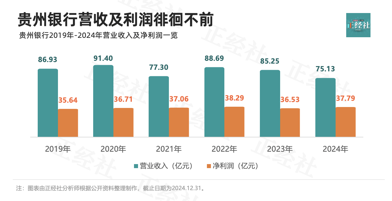 根据WIND提供的数据,2019年至2024年,贵州银行的营收和归母净利润起起落落,徘徊不前。营收分别为86.93亿元、91.40亿元、77.30亿元、88.69亿元、85.25亿元和75.13亿元,归母净利润分别为35.64亿元、36.71亿元、37.06亿元、38.29亿元、36.53亿元和37.79亿元。