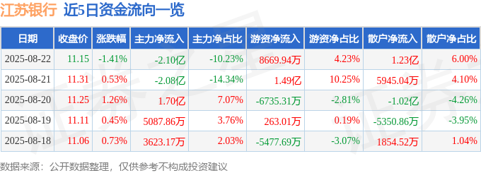 证券之星消息,截至2025年8月22日收盘,江苏银行(600919)报收于11.15元,下跌1.41%,换手率1.0%,成交量184.08万手,成交额20.5亿元。